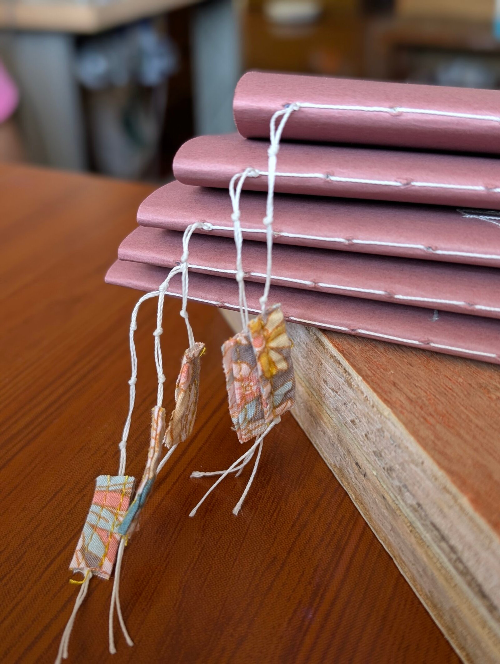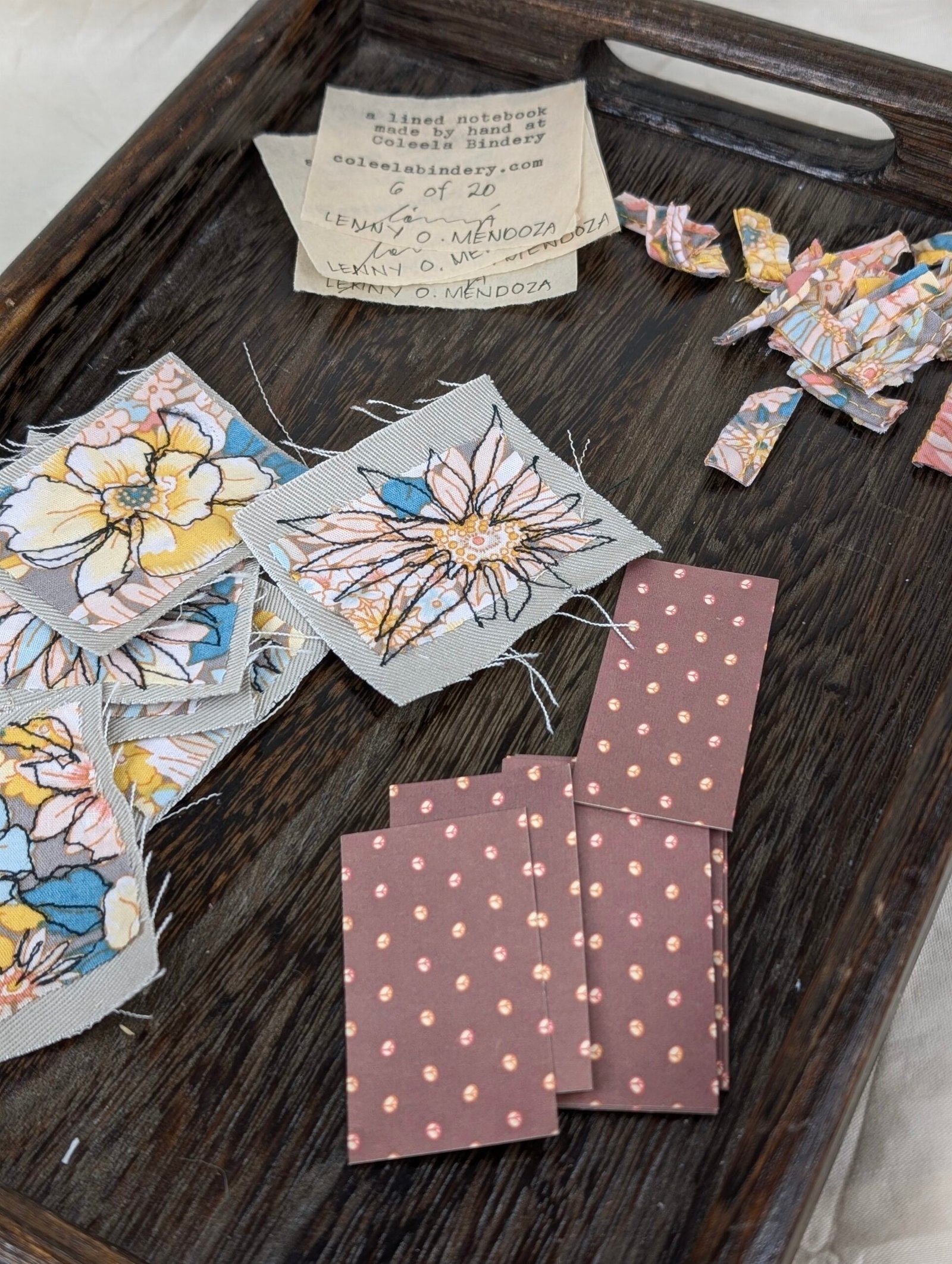 - cover: features a patch of thrifted floral fabric, loosely embroidered