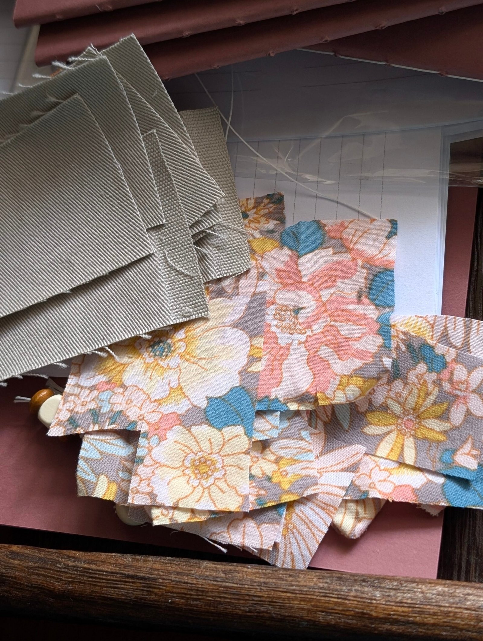 - a charm of the same thrifted fabric