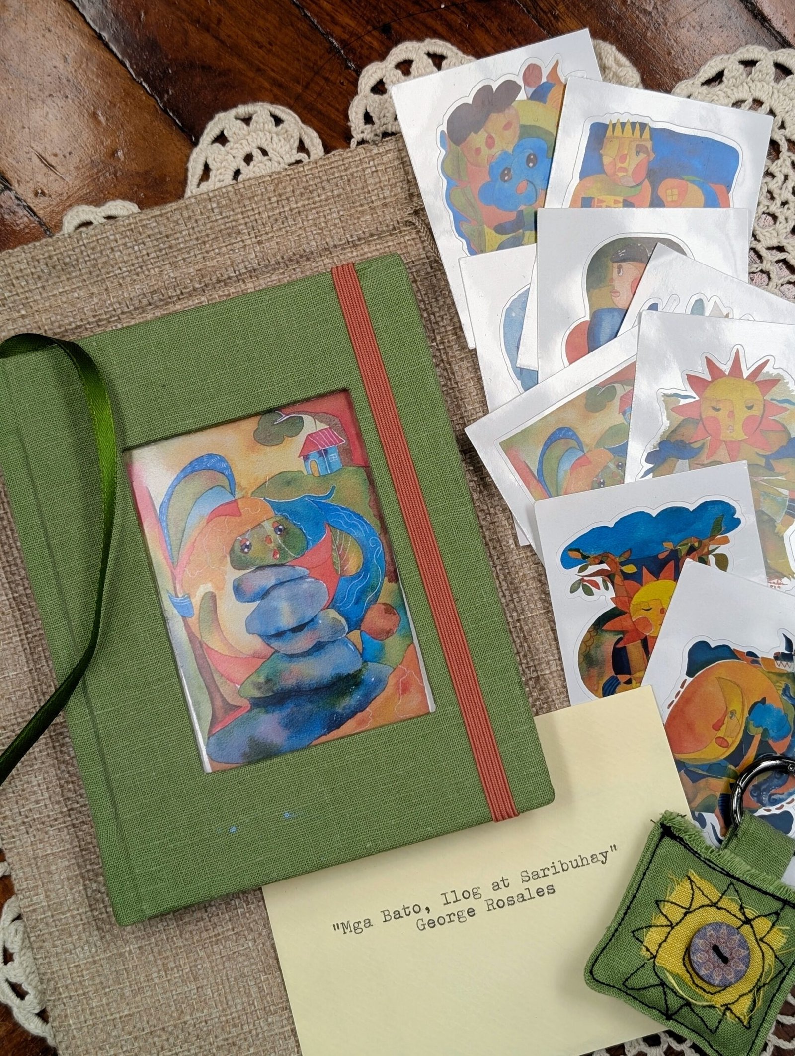 Each sketchbook is wrapped in a thrifted green curtain fabric and features a window showcasing a print from George Rosales’ Letters to Childhood—a series that reflects on the wonder and imagination of growing up.